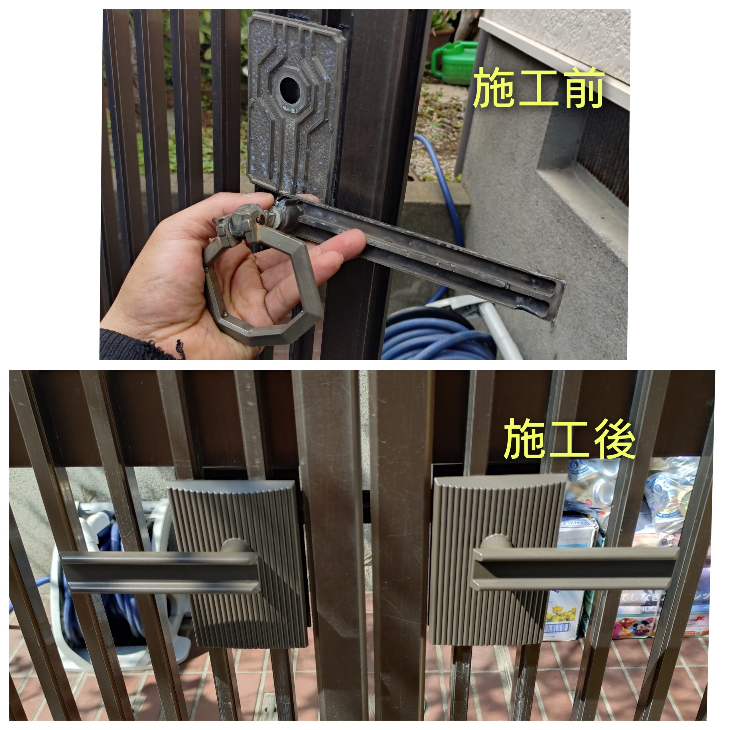 腐食して壊れてしまった門扉の取っ手を交換しました。