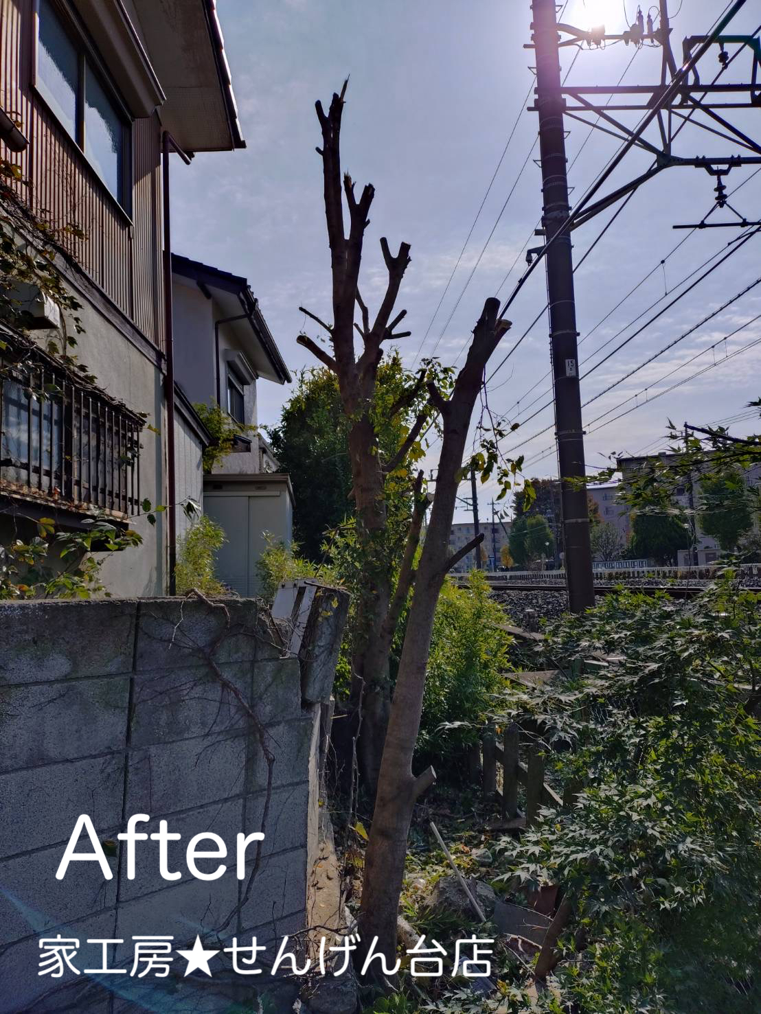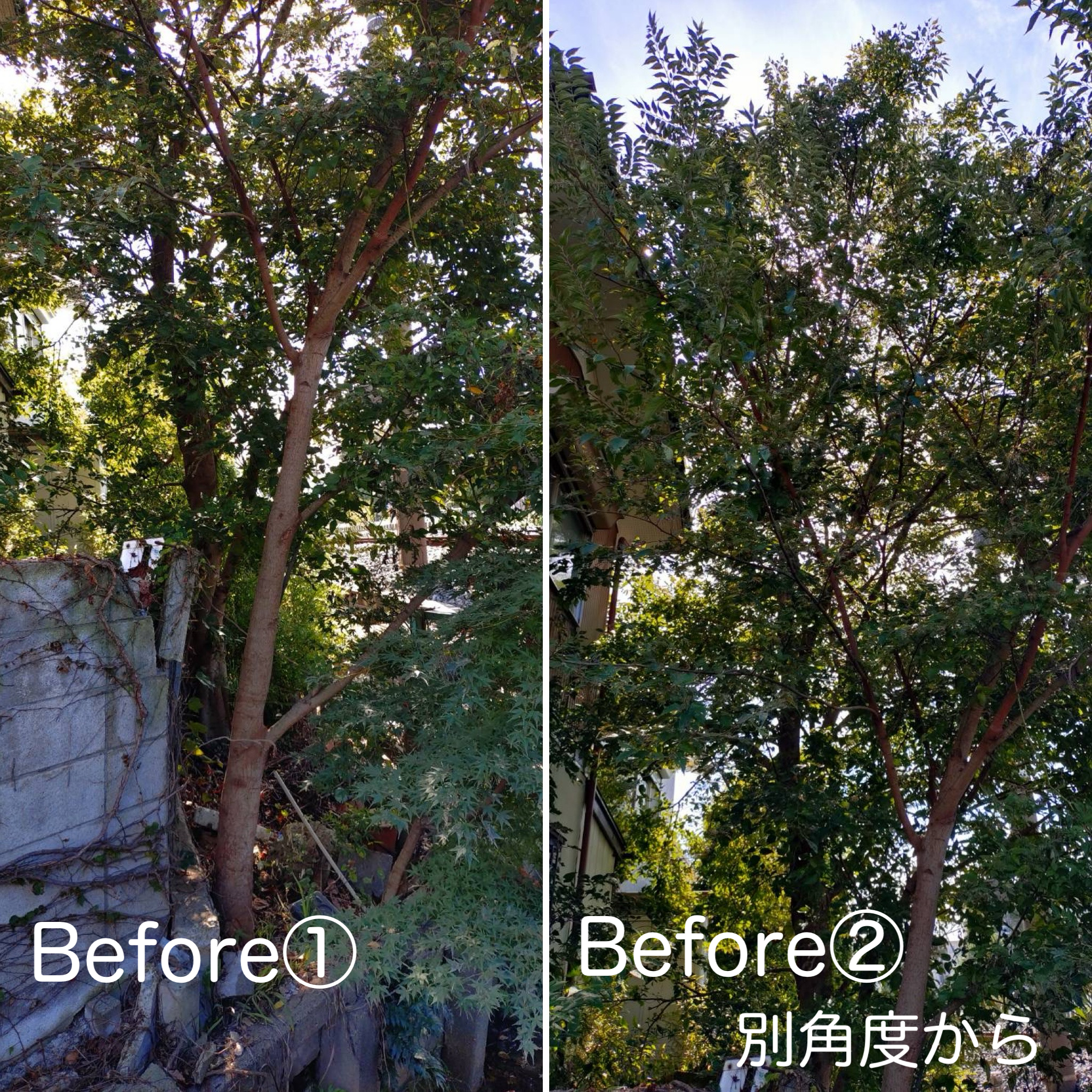 伸び切ってしまった木の枝を全て切り落として欲しいとの事で枝落としをしました。